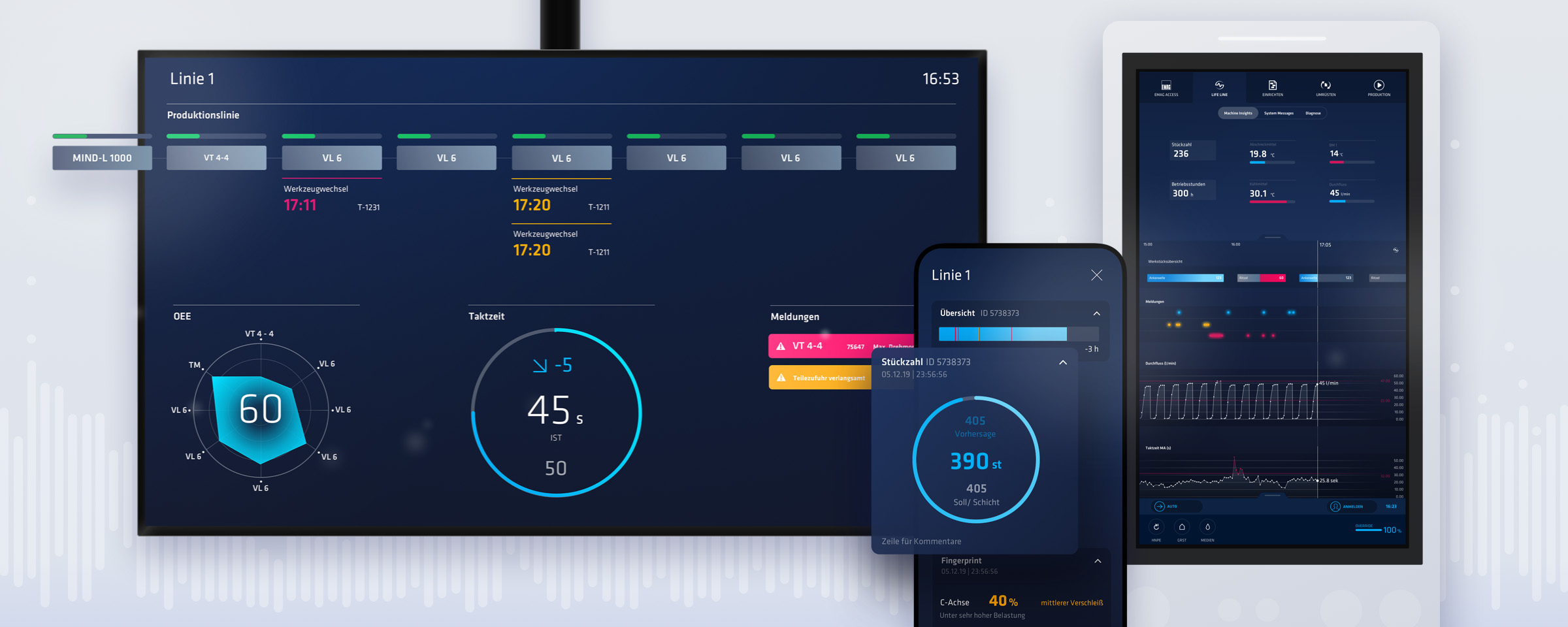 Cross-Device: Function and display are optimized for various contexts. From large status monitors in the production hall to apps for smartphones and smartwatches, the type and scope of content can be adapted to the user's context and needs.